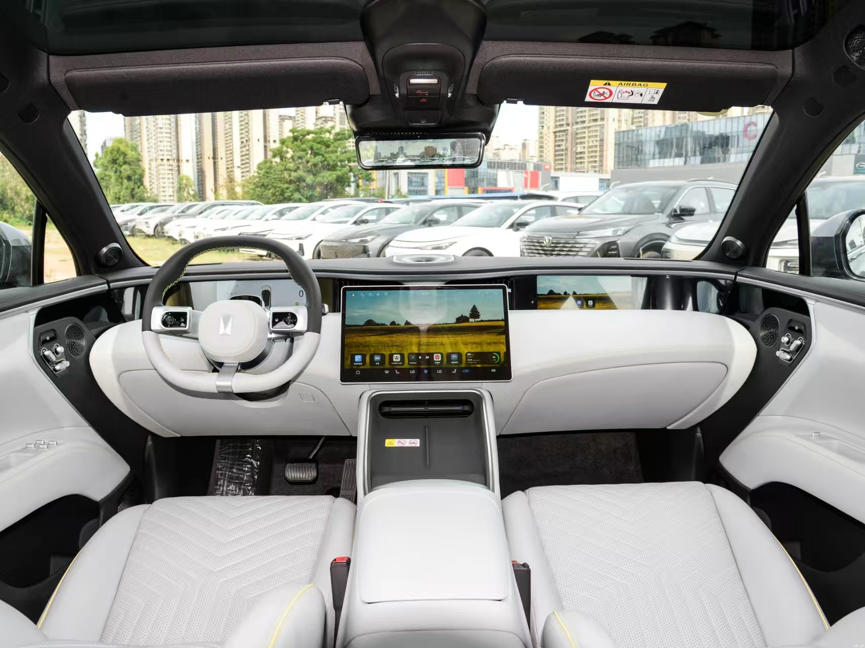 Avatr 11 adopts a very obvious wrap-around cabin design, with a more prominent technological atmosphere. Avatr 11 adopts two cabin design styles, “Green Gray” and “Burgundy Red”, and the “Green Gray” Interior is similar to a space capsule. The seats are wrapped in NAPPA leather and microfiber suede.