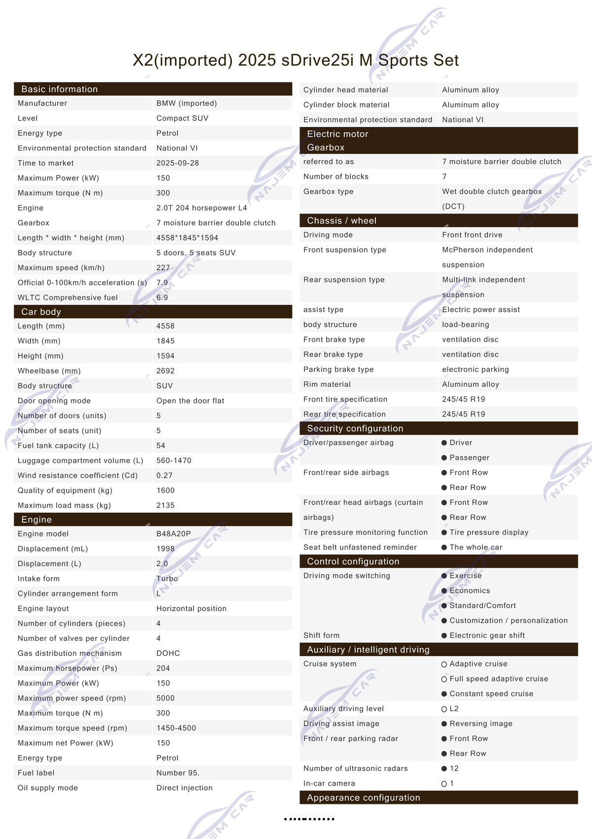 The all-new BMW X2, as the second generation of the family, features the latest generation of the BMW operating system and Level 2+ intelligent driver assistance system; it also includes an attention monitoring system and a capacitive steering wheel. The all-new X2 M35i strongly incorporates the M DNA, offering Matte Portimao Blue, Matte Pure Grey, and Storm Grey exterior colors; the M-exclusive Signal Green is also first applied to the all-new X2 M35i. The all-new BMW X2 xDrive25i M Sport Shadow Edition is equipped with a 2.0-liter inline four-cylinder turbocharged engine, delivering a maximum output of 150 kW and a peak torque of 300 Nm.