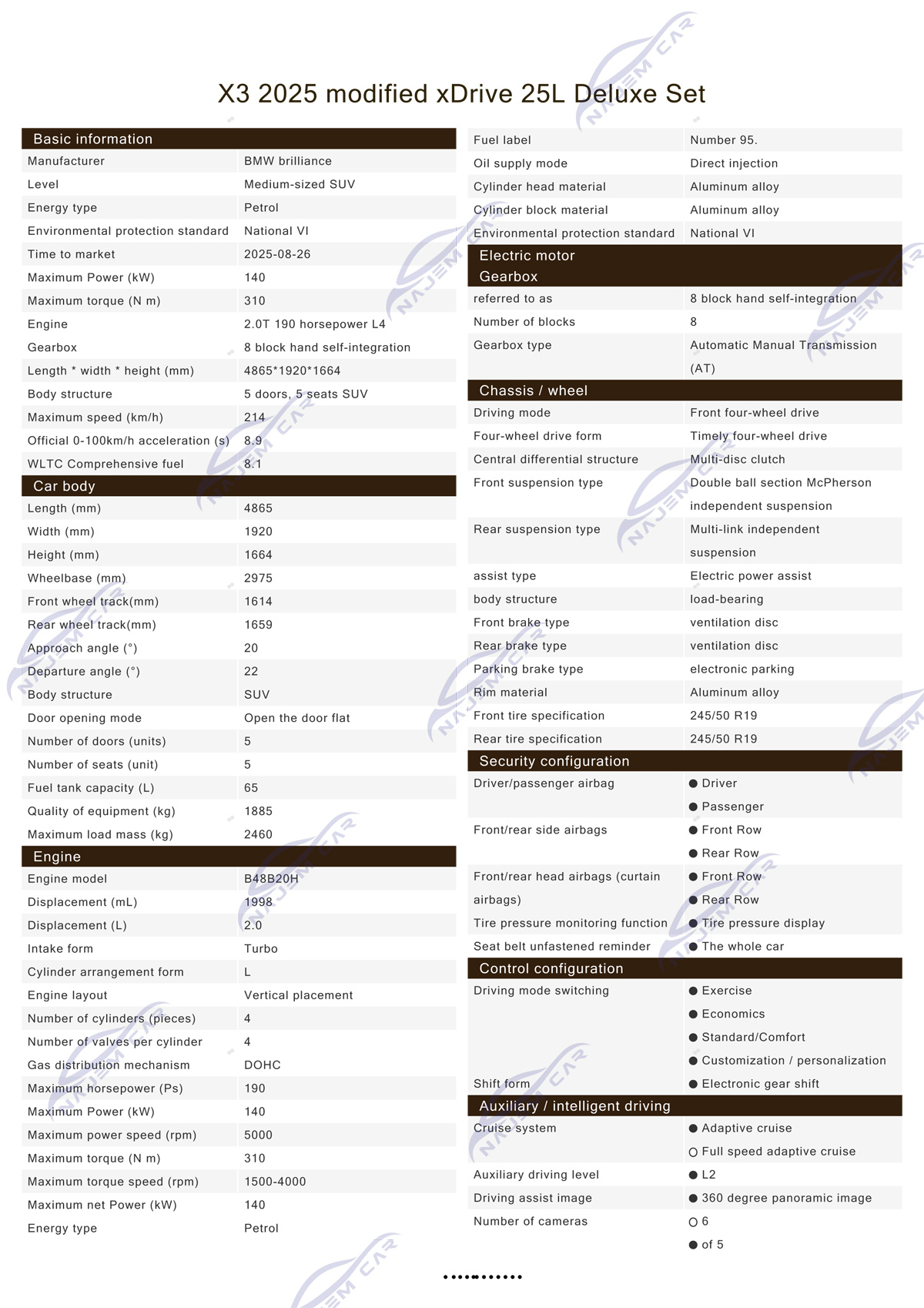 The 2025 BMW X3 measures 4865x1920x1664mm, with a wheelbase of 2975mm and a weight ranging from 1885-1915kg. All models are equipped with a 2.0T engine and an 8-speed automatic transmission, producing a maximum power output of 156kW to 211kW. Details such as the blacked-out front grille and other interior details have been updated to a blacked-out style. Six paint options are available, and it features the 9th generation BMW operating system.