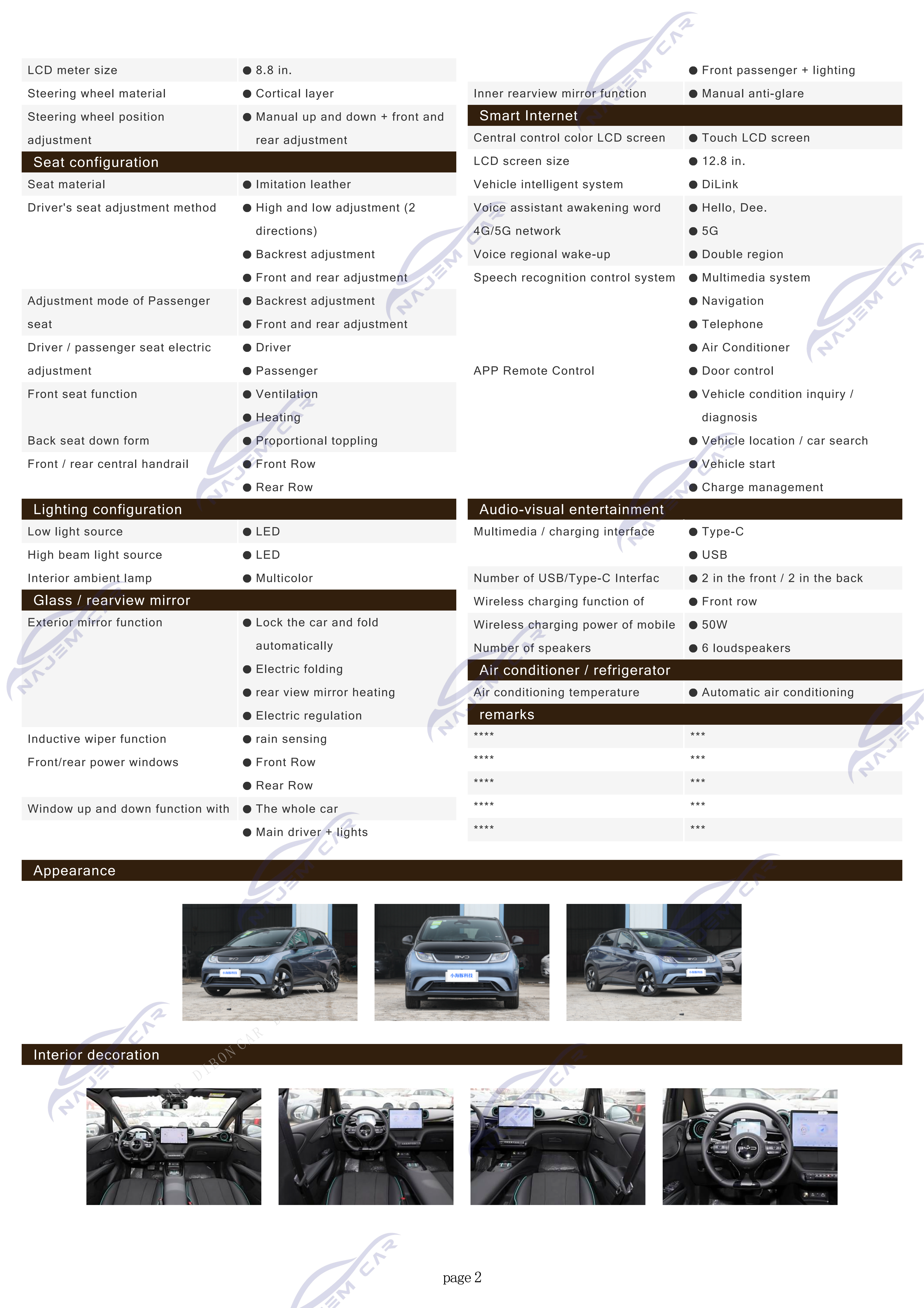 The BYD Dolphin is an all-electric compact car from BYD, the first model in the Ocean lineup, the first model to use BYD’s new logo, and the first model based on the BYD e Platform 3.0. The Dolphin has a long wheelbase of 2,700mm, with interior space comparable to that of a B-class car.