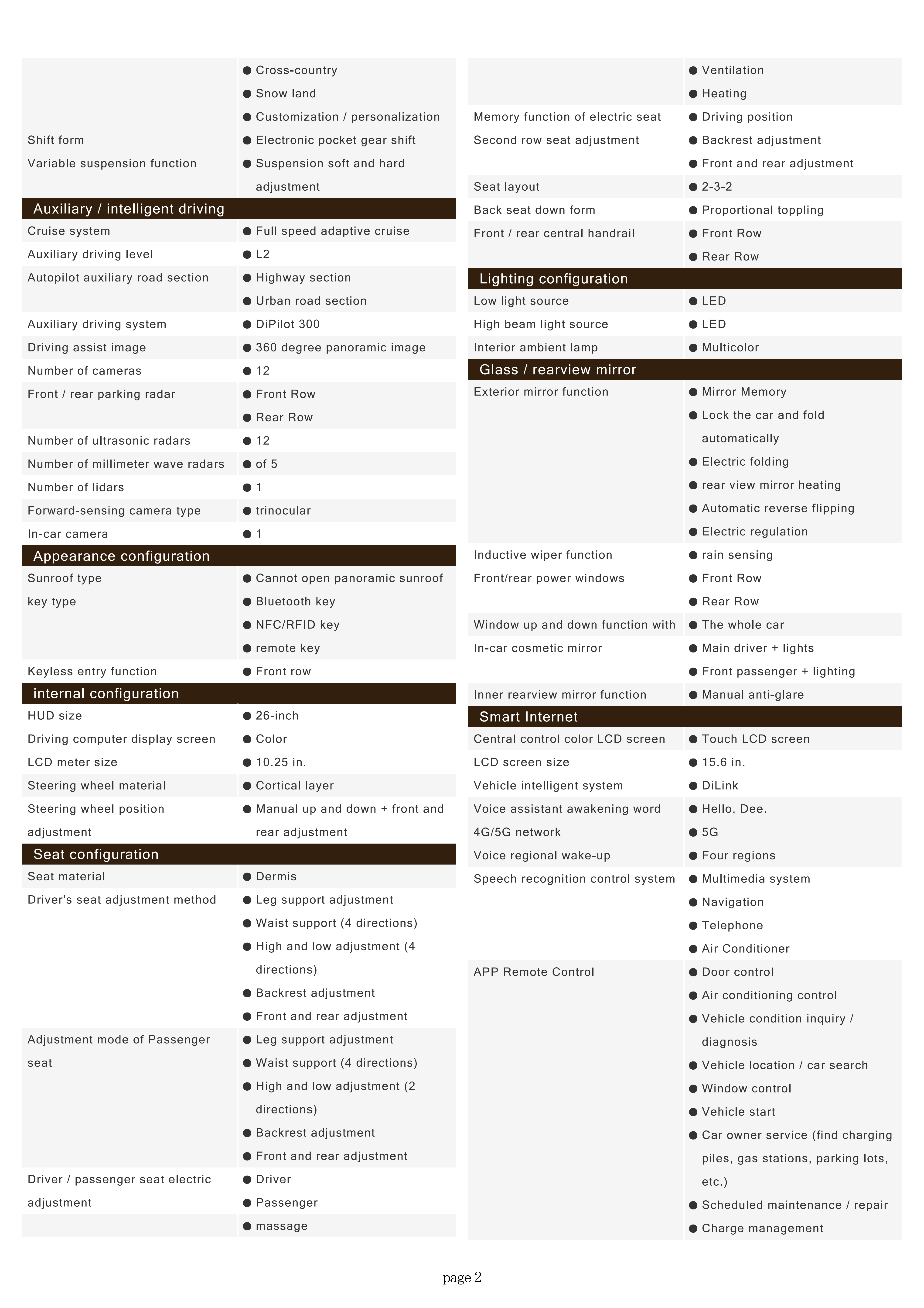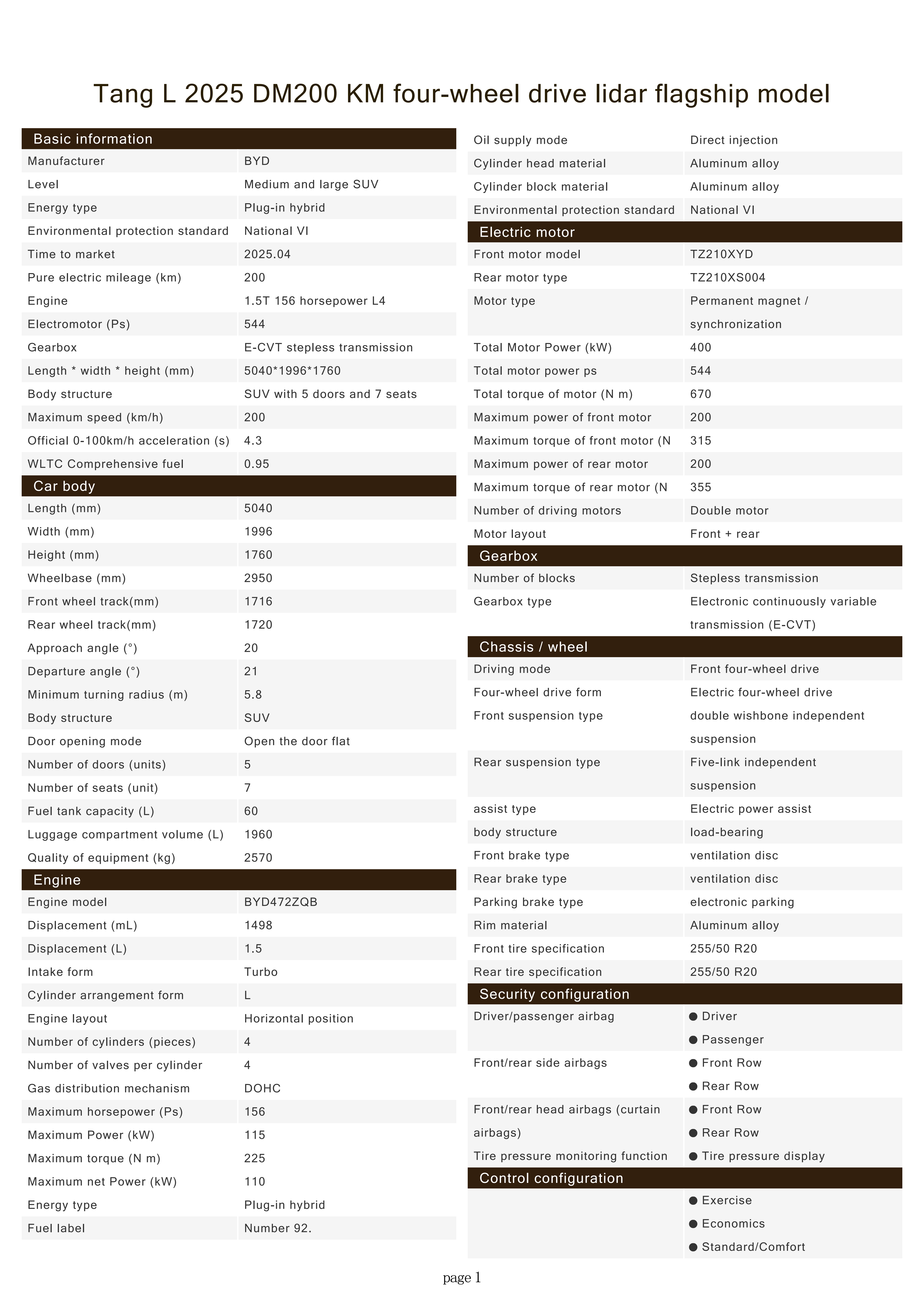 The BYD Tang L DM is powered by the fifth-generation DM technology, featuring a 1.5T hybrid-specific engine with a maximum power output of 115 kW and an electric motor with a power output of 200 kW. It is equipped with the Tian Shen Zhi Yan intelligent driving system, which utilizes BYD’s single-laser radar solution, and features the Yun Nian-C system.