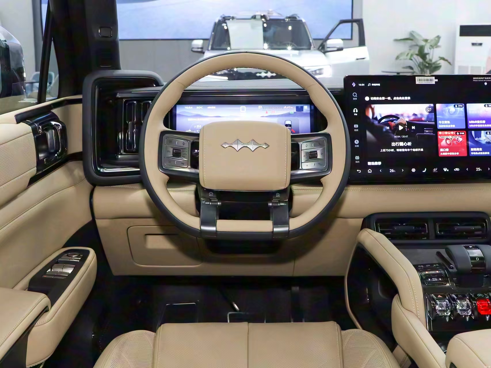 The angular interior of the Leopard 5, with its straight lines and square design, is stable and powerful, which is also very suitable for its hardcore off-road positioning. The center console carries a total of three screens, the center is a 15.6-inch 2.5K multimedia screen, the main driver uses a 12.3-inch instrument screen, and the passenger seat carries a 12.3-inch entertainment screen. The seats are upholstered in high-quality leather, which exhibits an elegant texture while providing excellent support and comfort.