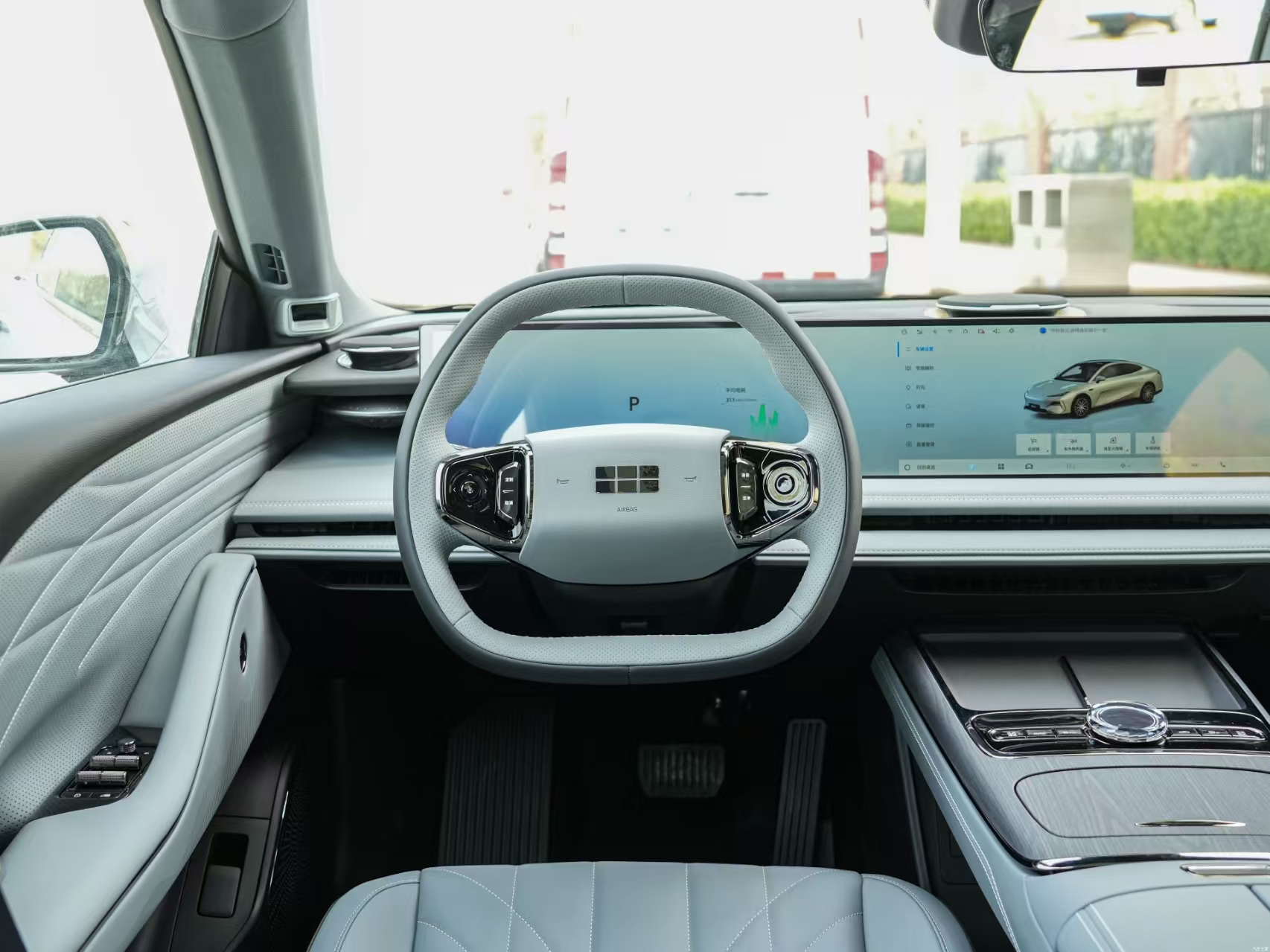 Interior, Geely Galaxy E8 is equipped with a 48-inch super grown-up joint screen, the screen resolution has reached an amazing 8K, with a 98% ultra-high screen-to-body ratio, and the thickness of the screen is only 9.8 millimeters, and the car is built with a Qualcomm Snapdragon 8295 chip. The design of the center console is very simple, the air conditioning vents are hidden, and the vehicle is also equipped with a yoke steering wheel (optional). Inside the vehicle is equipped with a 45-inch 8K through-connected screen, and I believe that everyone who opens the door will be attracted by this large screen. It is also equipped with a flat-bottomed, two-spoke multifunction steering wheel and run-through air conditioning vents, and it’s worth noting that the new car may also be offered with a half-spoke steering wheel option, which focuses on a sporty style.