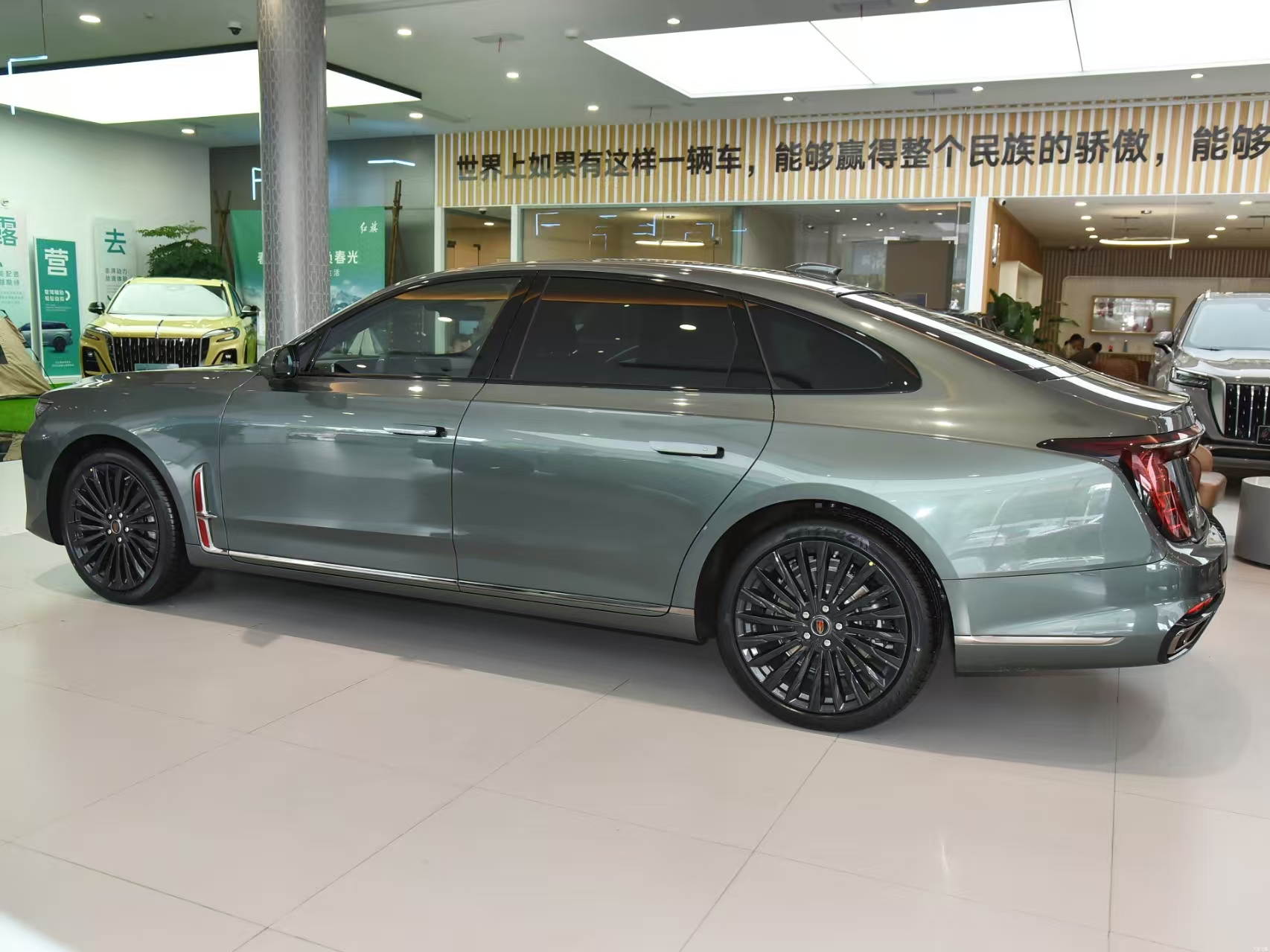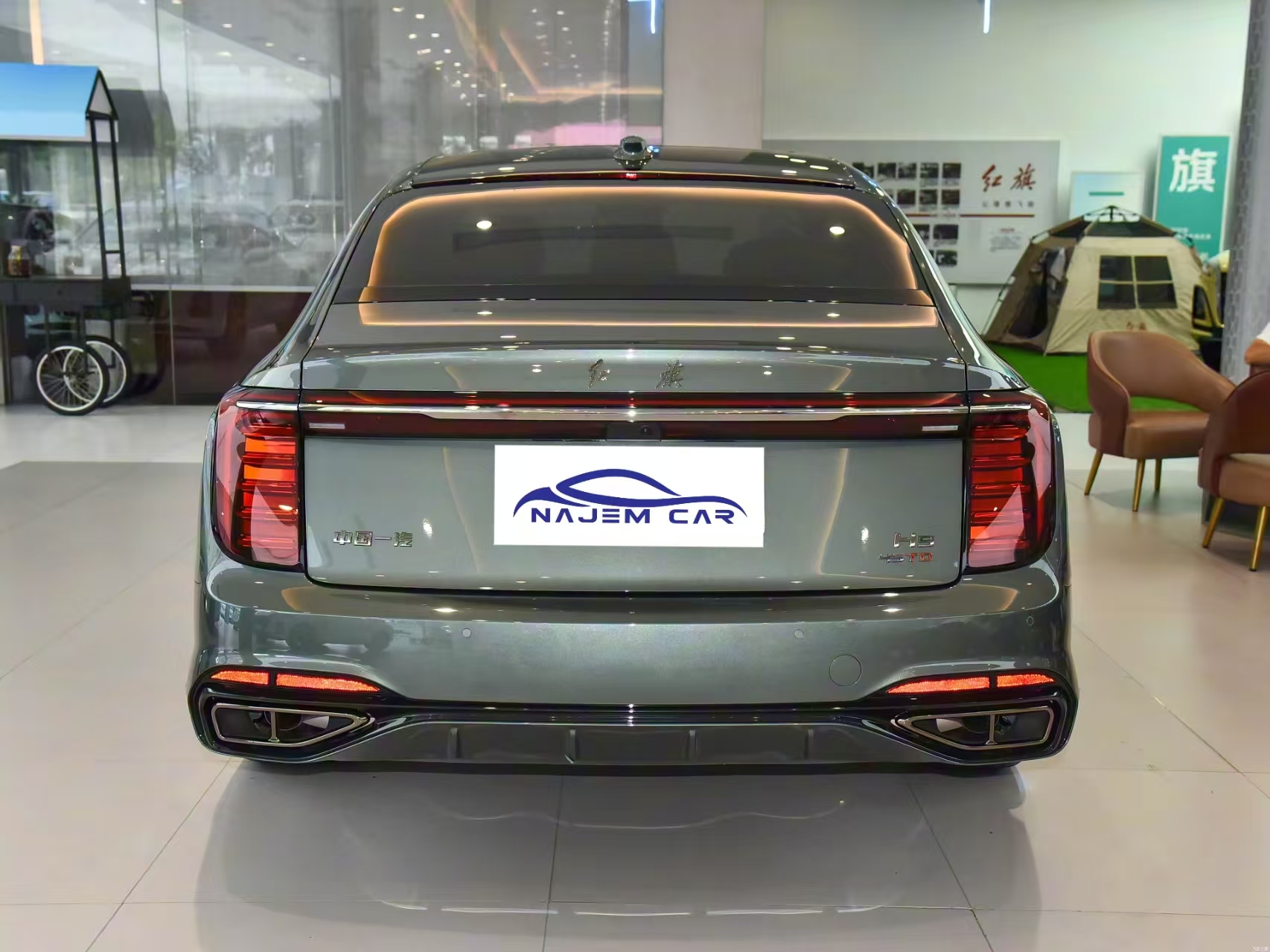 Hongqi H9 grille adopts a straight waterfall center net shape, and uses a split headlight design; the new car also uses LED light bands on the outer edge of the center net and the middle of the Hongqi logo, and integrates with the LED light clusters on both sides, making the new car futuristic dramatically increased. Side of the body, the new car roof line is very smooth, using the shape of the back body design, the front wing plate below the extension of the chrome trim has been continued to the rear part of the car, and with a large multi-spoke wheels and hidden door handle, so that the new car is very luxurious. Rear part, the new car also adopts the popular through the tail lamp design, stretching the vehicle horizontal visual width at the same time also echoed with the front, to enhance the new car recognizability. The new car also uses a bilateral total of two exhaust styling. Body dimensions, the new car length, width and height of 5137/1904/1493mm, wheelbase of 3060mm.