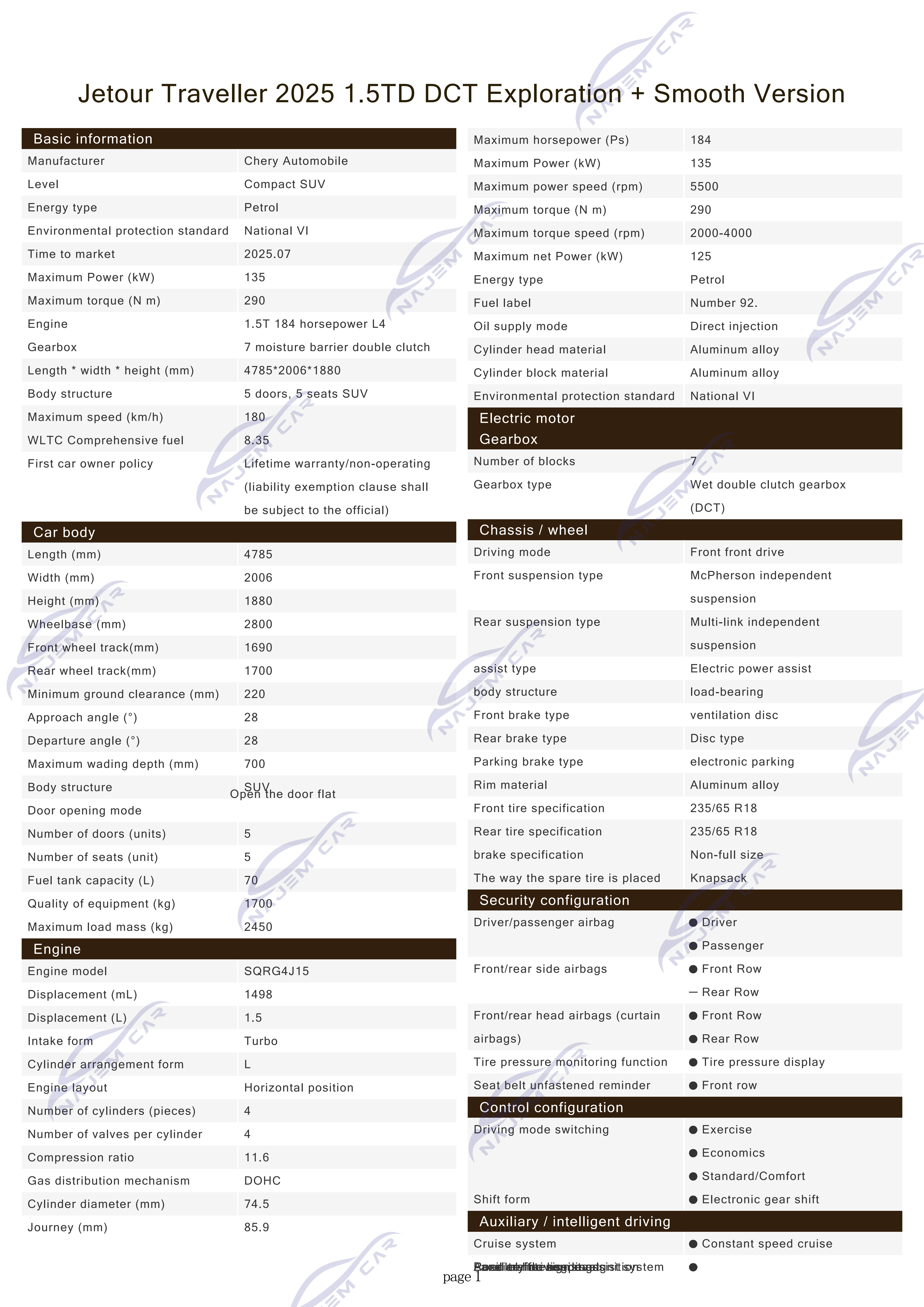 The Jetour Traveler is a mid-size SUV launched by Chery Automobile, positioned as the first model in its light off-road series. It measures 4785×2006×1880mm (wheelbase 2800mm) and offers three powertrain options: a 1.5T, a 2.0T gasoline version, and a hybrid version. Pre-sales began on August 25, 2023, at the Chengdu Auto Show, with a pre-sale price range of 150,000 to 250,000 yuan. A 2.0T Yueye version was added on April 5, 2025, equipped with a 7-speed wet dual-clutch transmission.