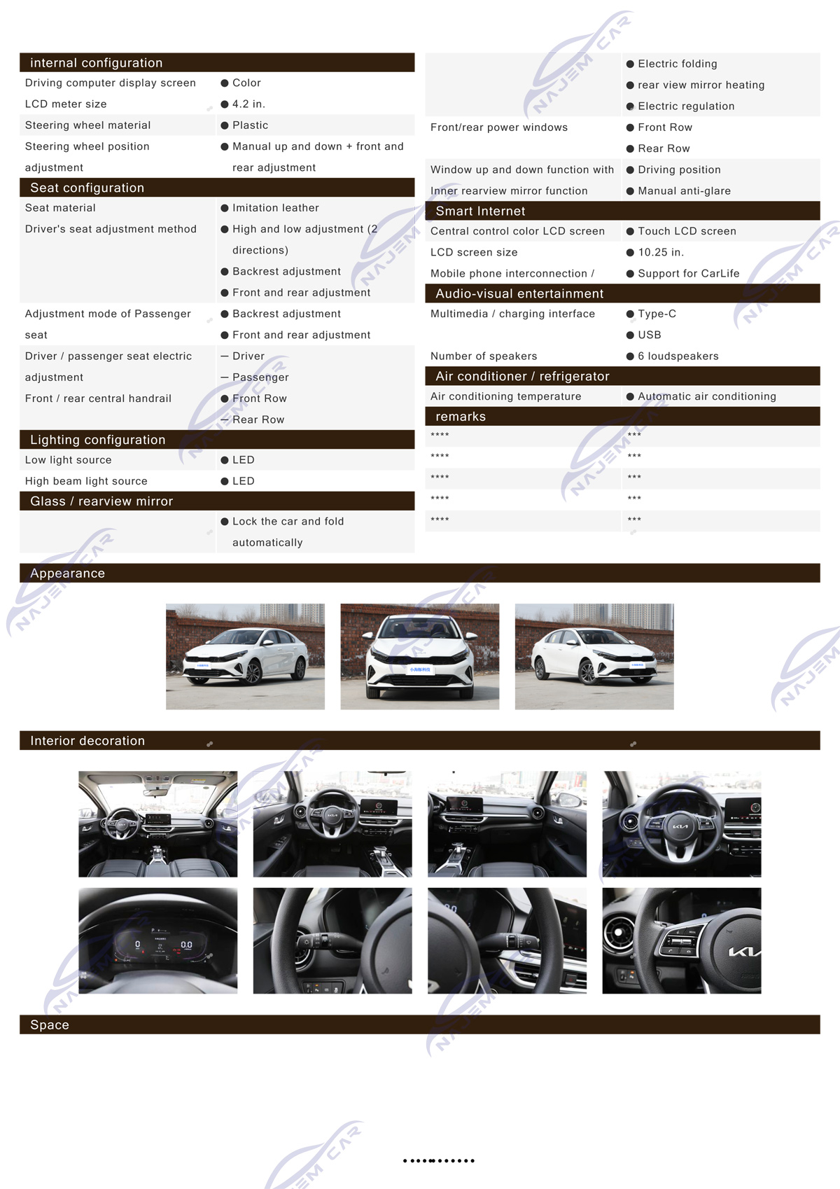 Kia K3 inherits the family tiger tsunami type front face, adopts the radical and sporty straight waterfall front center net design, LED daytime running lights and turn signal lights into one, very visual tension and sense of movement. Side of the body, Kia K3 adopts a double waistline design, upward double waistline design, creating a sense of speed swooping, applying the overclass surround chrome door and window lines to enhance the sense of seniority, supplemented by the only standard 17-inch Large Wheel in the same class, bringing the domineering appearance of the face value is more outstanding. At the rear of the vehicle, the Kia K3 shows a simple and sporty coupe style, with a technologically stylish combination of penetrating LED taillights, a layered rear bumper, and a chrome-plated dual-exhaust pipe design, which adds to the sense of premium and sportiness.