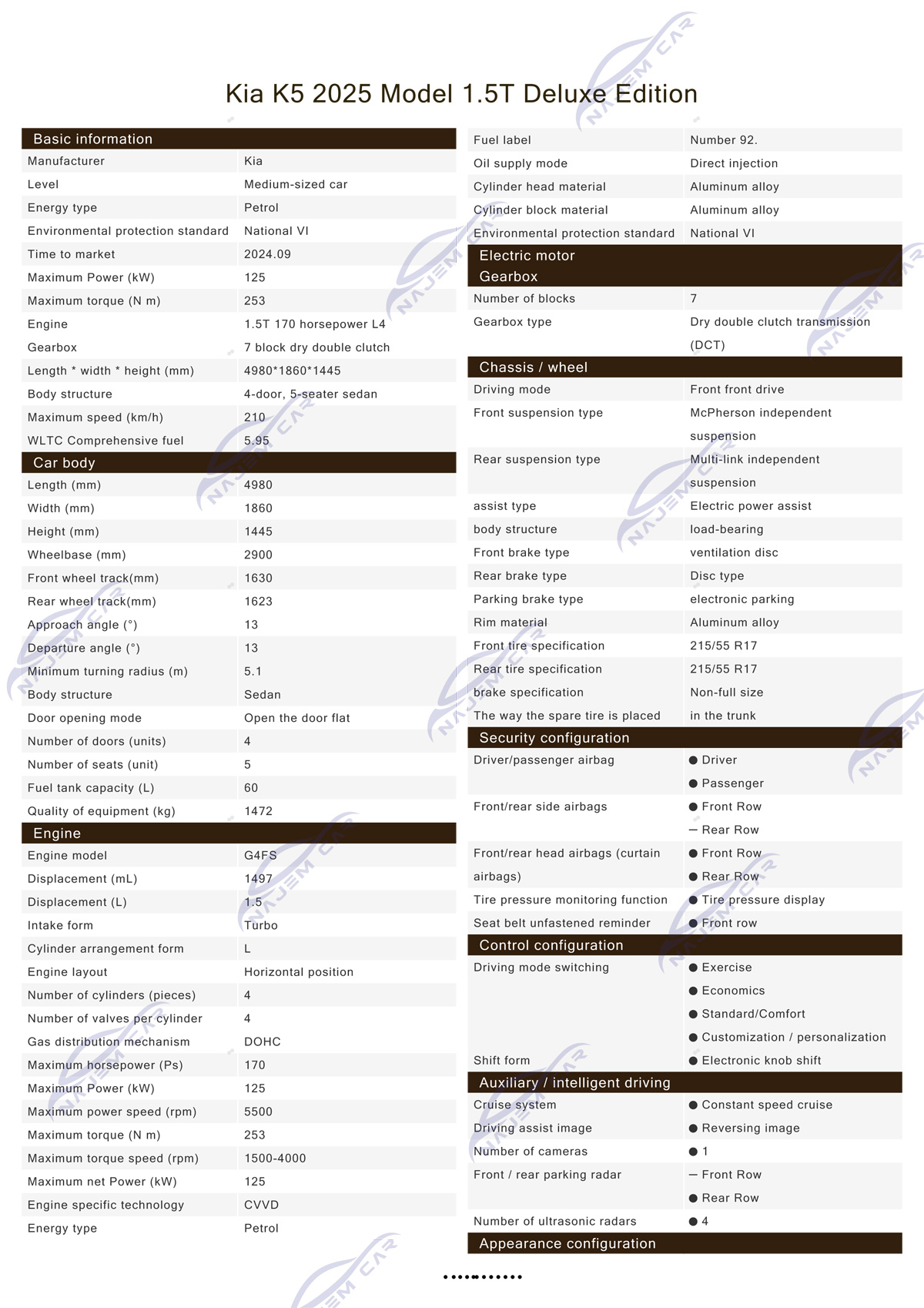 Kia K5 provides two types of power: 1.5T and 2.0T, of which the 1.5T engine takes the lead in applying the world’s original fourth-generation CVVD engine technology, matched with a 7DCT gearbox, with a maximum power of 170 hp, a maximum torque of 253 Nm, and a comprehensive fuel consumption of 5.6 liters per 100 kilometers, which is a high power and low consumption; the 2.0T engine, matched with an 8AT transmission, has a maximum power of up to 240 hp and a maximum torque of 353 Nm. The 2.0T engine, matched with 8AT transmission, has a maximum power of up to 240 hp, a maximum torque of 353 Nm, and a comprehensive fuel consumption of 6.8 liters per 100 km.