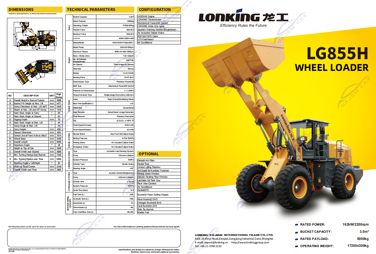 1. Powerful function: The LongGong LG855HG loader has a large loading capacity and unloading height, which can adapt to various working environments and requirements. Its maximum loading capacity can reach 5 tons, and the maximum unloading height is 3.8 meters, which can meet the needs of most loading and unloading work. two Flexible operation: The loader adopts a hydraulic control system, with a reasonable layout of control levers and operation consoles, and good control feel, which can achieve precise operation and improve work efficiency. At the same time, it is also equipped with convenient and adjustable seats and a visual system, improving the comfort and safety of the operator. three Fuel Economy: The LongGong LG855HG loader adopts advanced engine technology, with low fuel consumption and high energy efficiency ratio, resulting in good fuel economy. In addition, it is also equipped with intelligent energy-saving technology, which can automatically adjust engine power and fuel consumption according to actual working conditions, improving fuel utilization efficiency. four Easy maintenance: The main components of this loader are designed with modularity, making it easy to disassemble, assemble, and replace, reducing maintenance time and costs. At the same time, it also has a good automatic diagnosis and remote monitoring system, which can timely detect and eliminate faults, improving the reliability and maintainability of the equipment. five Good safety performance: The LongGong LG855HG loader adopts multiple safety protection measures, such as overload protection, pressure relief valve, and brake system, to ensure safety during operation. In addition, it also has good handling stability and smooth driving, reducing the risk of accidents. In summary, the LongGong LG855HG loader has several obvious advantages, including powerful functionality, flexible handling, fuel economy, convenient maintenance, and good safety performance.
