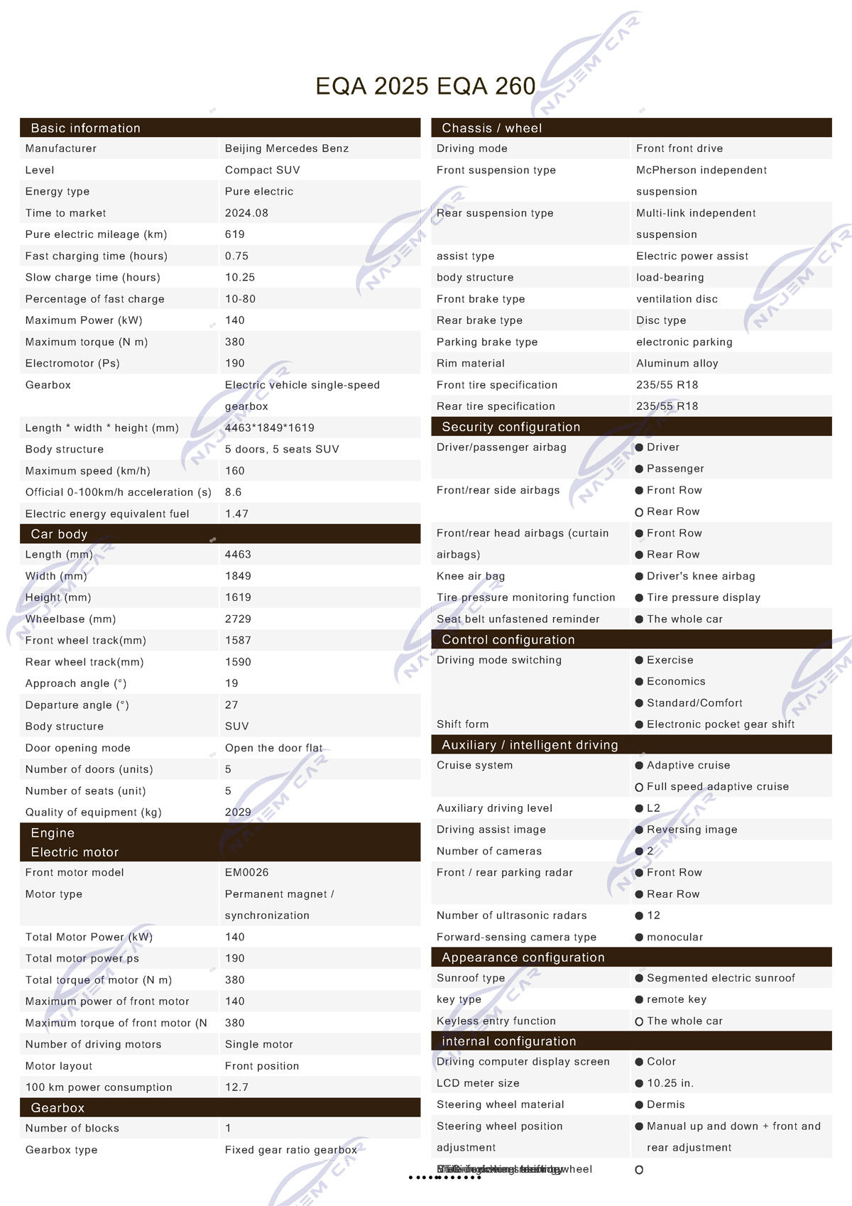 Mercedes-Benz EQA is a pure electric compact SUV under Mercedes-EQ, officially launched on November 19, 2021, with body dimensions of 4463mm1834mm1619mm, wheelbase of 2829mm, and a simple and full body shape that is very durable. It demonstrates the Mercedes-Benz brand’s leading attitude and innovative ability towards electrification technology, providing an excellent driving and riding experience.