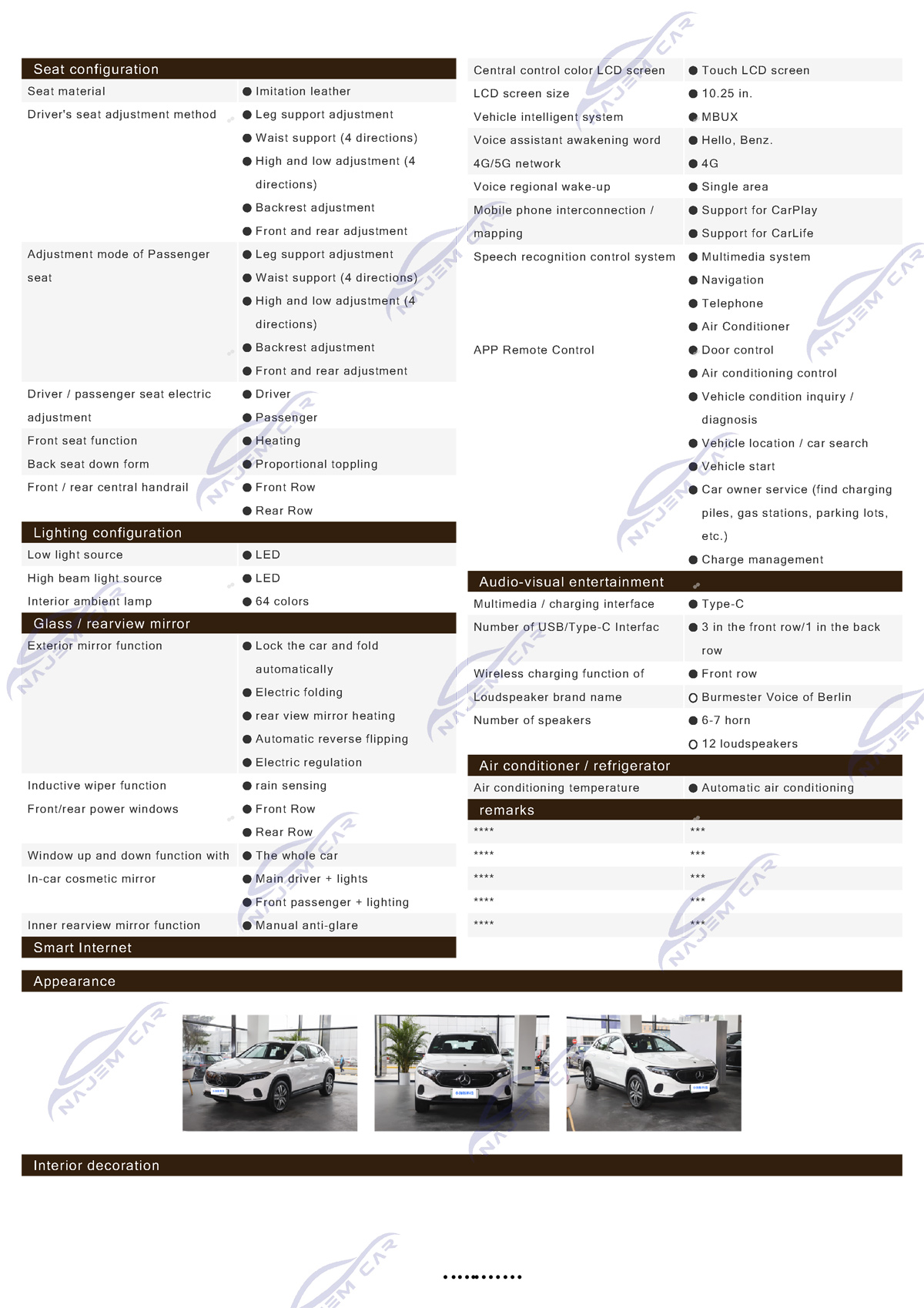 In terms of configuration, the EQA offers a wealth of option packages and technological configurations, including the Intelligent Pilot Steering Function, Intelligent Pilot Distance Limit Function, and Blind Spot Assist, which provide drivers with all-around safety and security. In addition, the vehicle is equipped with the GOD Customized Navigation System and MBUX Intelligent Human-Machine Interaction System, which enhances the convenience and fun of driving.
