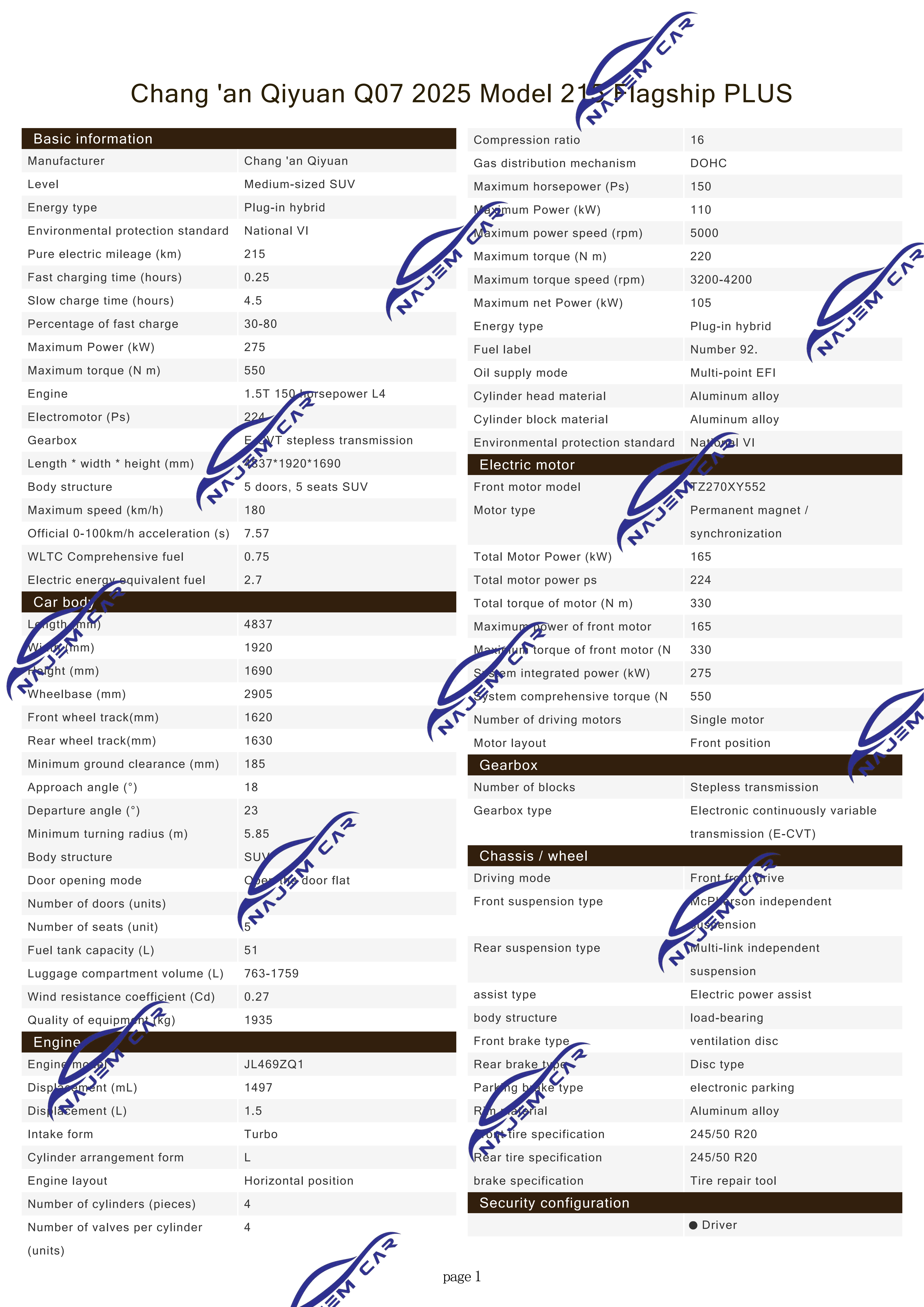 Changan NEVO Q07 is powered by the Smart New Blue Whale 3.0 powertrain system, offering two hybrid systems: a 1.5T and a 1.5L. The 1.5T engine delivers a maximum power output of 110 kW, with a pure electric range of 215 km and a combined range exceeding 1,400 km. The fuel consumption under battery depletion is 3.9 L/100 km, and it also supports fast charging, with a charging time of just 15 minutes from 30% to 80%. The 1.5L version has a maximum power output of 72 kW, with two pure electric range options of 145 km and 215 km.