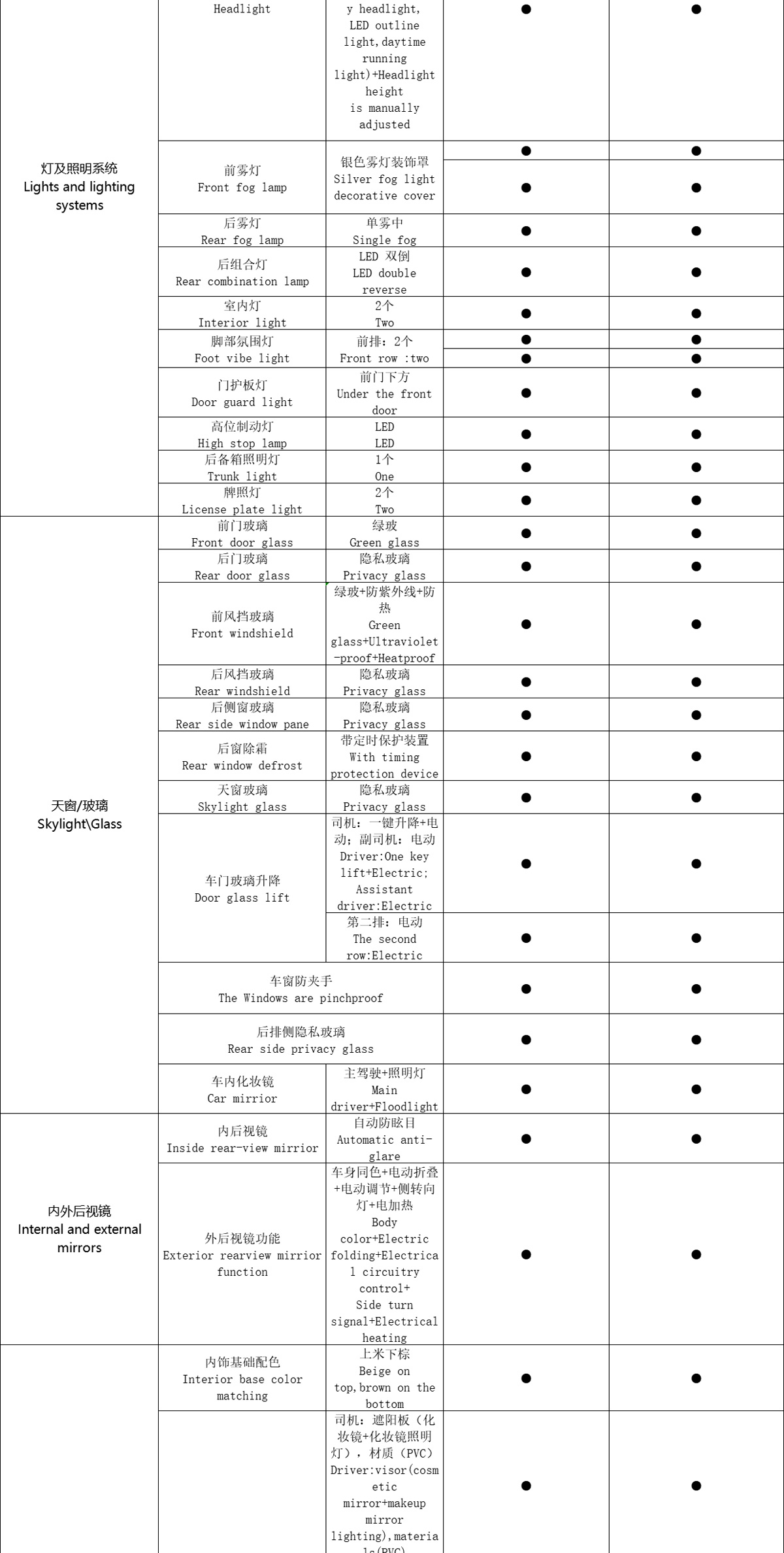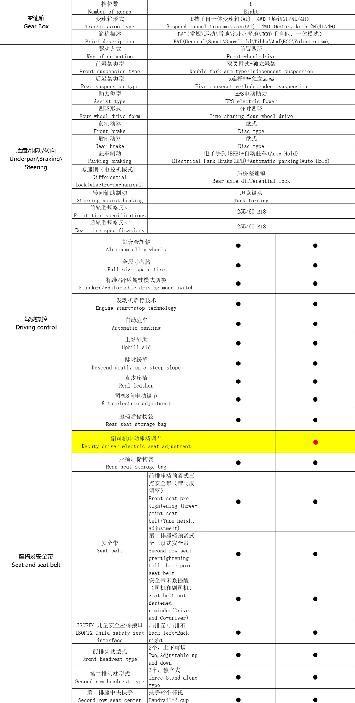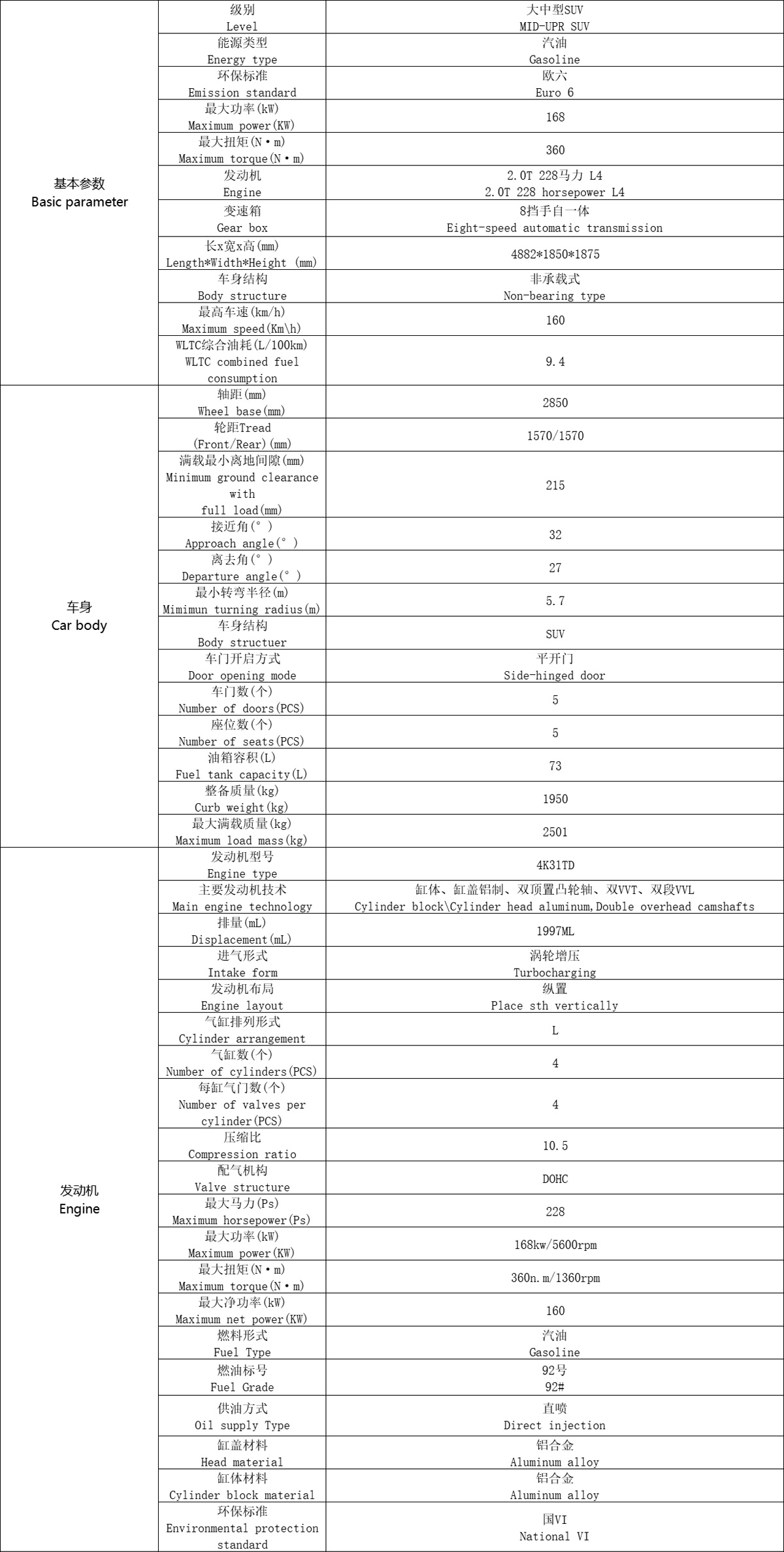 The Paladin is equipped with an automatic transmission (AT), with a maximum power of 168KW and a maximum torque of 360N.m. In terms of features, the Paladin is equipped with driving mode selection, remote key, Bluetooth key, rear wiper, ambient lighting, engine start-stop system, and other features.