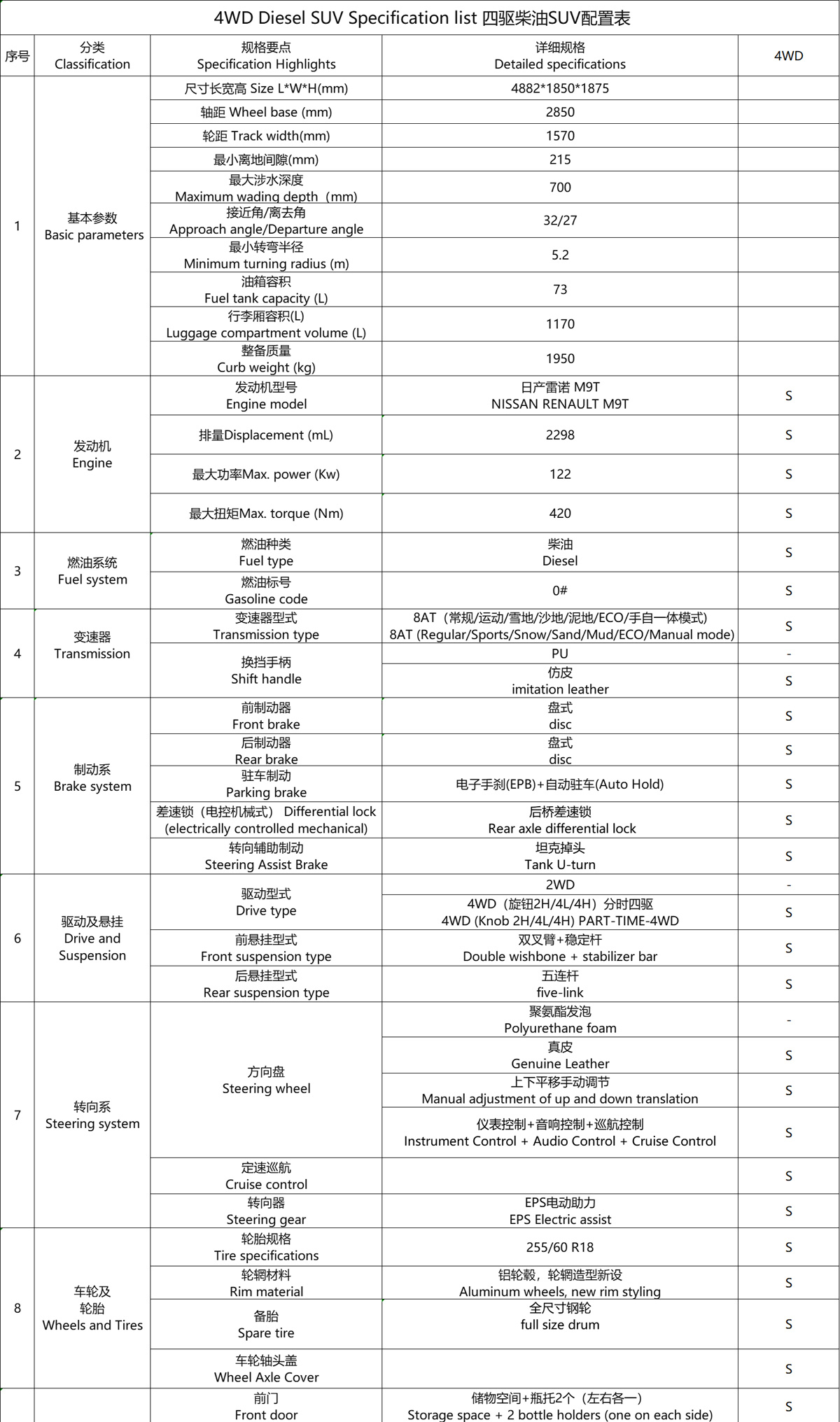 The Paladin is equipped with an automatic transmission (AT), with a maximum power of 168KW and a maximum torque of 360N.m. In terms of features, the Paladin is equipped with driving mode selection, remote key, Bluetooth key, rear wiper, ambient lighting, engine start-stop system, and other features.