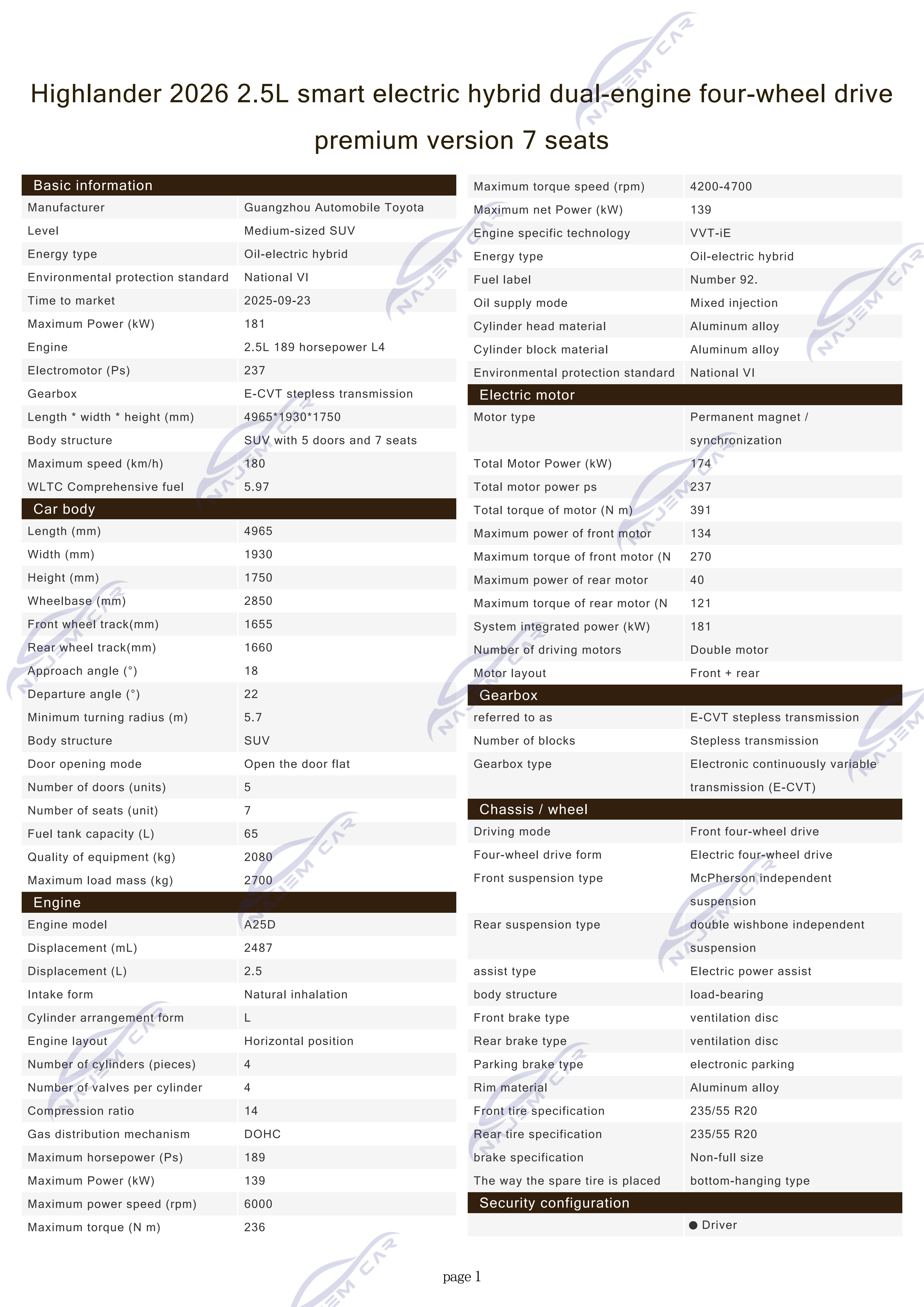 The Highlander is a Toyota vehicle, a large SUV in the Toyota family. It is known for its spacious body and innovative interior space, while offering the highest level of safety equipment in its class. The Highlander officially launched in China on July 2, 2007, and was produced domestically by GAC Toyota on April 12, 2009. The fourth-generation Highlander officially launched on June 25, 2021, and the 2024 Highlander launched on May 31, 2024. At the “GAC Toyota 2025 Technology Day” press conference on June 12, 2025, GAC Toyota officially announced its embrace of range-extended hybrid technology, debuting it in the new generation Highlander.